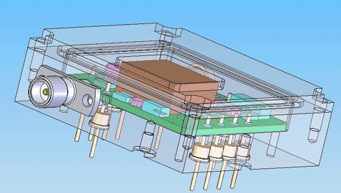 Layout, mechanical design and enclosure design. Multiple iterations between this plug-in module and motherboard, schematic, mechanical and layout in order to fit everything. For PCB RF material Rogers 4004 has been used to allow operation up to 6GHz. Enclosure - milled 6061-T6 aluminum. Design time - 2 weeks.